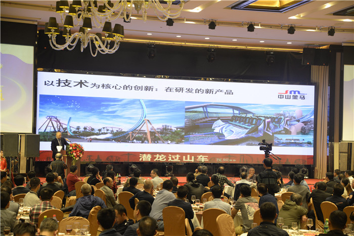 當(dāng)日,晚宴現(xiàn)場燈光璀璨,鮮花吐蕊;臺上歌舞升平,奏樂交織;臺下同仁相邀,觥籌談歡,其樂融融。整個宴會廳洋溢著一片和諧、溫馨、歡樂的氛圍。晚宴開場,公司總經(jīng)理劉總上臺致辭,對座下眾賓客的到來致以熱烈的歡迎,對長期以來關(guān)心和支持金馬發(fā)展的合作伙伴表示了誠摯的感謝,并向來賓們介紹了公司的經(jīng)營理念、企業(yè)文化、服務(wù)承諾和產(chǎn)品優(yōu)勢等。致辭中,劉總就公司最新研發(fā)和交付的產(chǎn)品作了詳細(xì)的介紹和視頻演示,斷軌過山車、垂直過山車、寬翼過山車、國內(nèi)最大飛行塔、國內(nèi)最高礦山車、室內(nèi)影視過山車等多項(xiàng)新技術(shù)、新產(chǎn)品不斷涌現(xiàn)在舞臺大屏中,真實(shí)錄制的設(shè)備運(yùn)作視頻和逼真的研發(fā)產(chǎn)品模擬情景,如磁石般吸引著諸多聚焦的目光,更贏得了眾賓客的頻頻驚喜驚艷驚嘆的贊許聲。