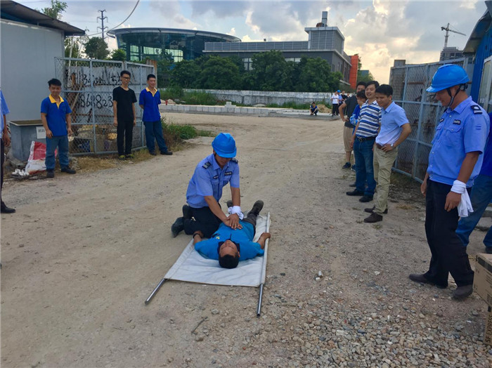 模擬火災(zāi)現(xiàn)場消防演習(xí)設(shè)定30畝產(chǎn)品堆放區(qū)為著火點(diǎn),分為四個組配合完成任務(wù)。第一組(滅火組)快速趕到事發(fā)地切斷電源,組員接好水帶水槍,用滅火器滅火;第二組(人員疏散組)組織疏散現(xiàn)場周圍人員,沿出口指示方向撤至一樓安全地方,保證樓道暢通,防止踩踏事故;第三組(人員物資搶救組)配合滅火組清理現(xiàn)場周圍物品,開辟防火隔離帶,救護(hù)傷員,用人工呼吸作簡單救治;第四組(照明、通訊組)配合其他三組負(fù)責(zé)場地照明、報(bào)警、模擬說明地址接警車、保證車道暢通到事發(fā)現(xiàn)場,滅火后留現(xiàn)場值班,防止二次火災(zāi)發(fā)生。