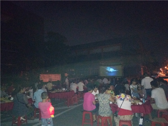 19:00,隨著夜幕降臨,本次活動的重頭戲也即將開始:戶外觀影《戰(zhàn)狼2》。在一旁的放映工作人員搭建好放映幕布、調(diào)試好放映燈光等設(shè)備后,一束射燈穿透黑暗,電影正式開始。前一秒還在熱烈交談、縱享美食的座上賓們頓時安靜了下來,目光不約而同地投向了大屏幕;一旁的小孩也不再繼續(xù)搗騰手中的燈籠,而是提著小燈籠歡快地跑到幕布最前方,如圖平日上課般安靜且認真地融入了這片視覺與聽覺齊體驗的氛圍中。