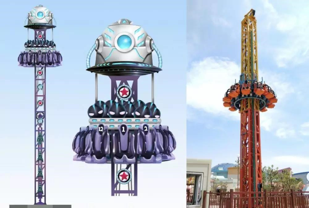 QWT-12D旋轉青蛙跳是一款塔類游樂項目,主要由塔體、塔底架、座艙組成,通過鋼絲繩,滑輪組和油缸帶動下,座艙可以在塔體上做上下移動。通過使用蓄能器和電氣控制,使座艙完成像青蛙一樣跳動的動作,讓游客經(jīng)歷從失重,到減速,再到回彈等一系列連貫的動作,充分體驗到這種連貫跳躍的樂趣。除此之外,座艙結構分為內(nèi)外圈,外圈乘客部分在跳躍過程中,還會隨著電機的帶動下旋轉,增加跳躍動作的復雜性,并增加游客的視覺空間。