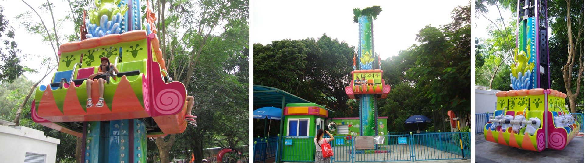 座艙沿著豎直的立柱軌道上升下降,連貫的跳躍運(yùn)動(dòng),使乘客在超重與失重的過(guò)程中體驗(yàn)到驚險(xiǎn)與刺激;