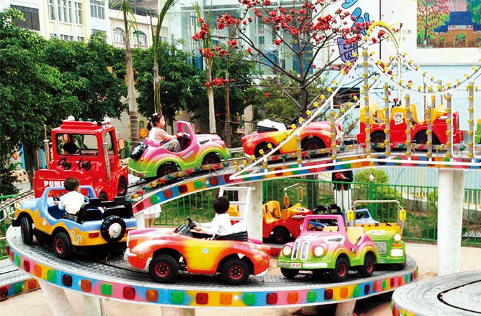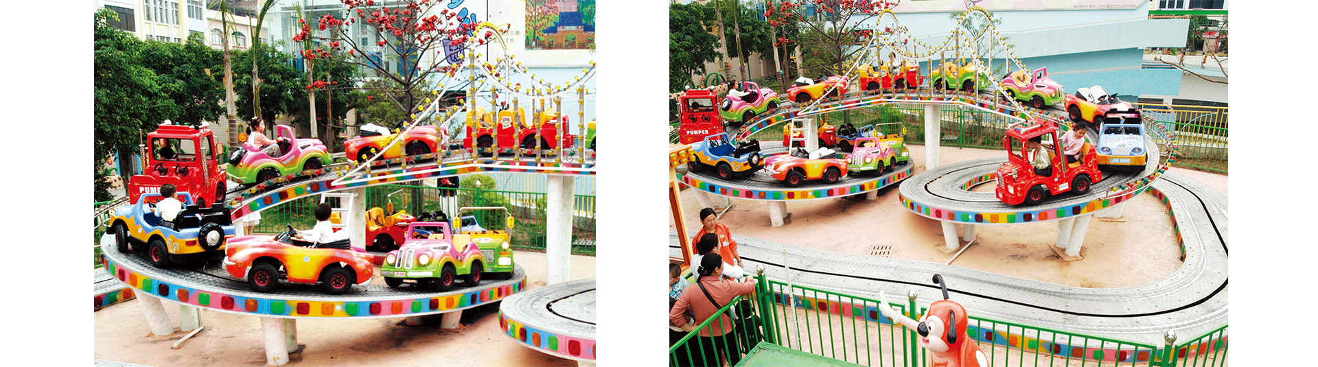 小朋友們開著自己心愛(ài)的小車輛翻山越嶺、追逐嬉戲;配有歡快優(yōu)美的音樂(lè),氣氛輕松。小車沿軌道自動(dòng)轉(zhuǎn)向,盤旋在綿延起伏的立交軌道上,時(shí)高時(shí)低,你追人趕,令孩子們體會(huì)翻山越嶺和飛越時(shí)空的感覺(jué),夠刺激而絕無(wú)恐慌之感。