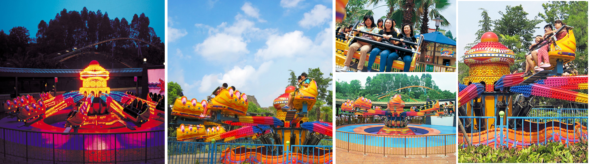 彈跳機(jī)中軸為中心帶動周圍十二個座艙繞豎直中軸旋轉(zhuǎn),同時座艙伴隨著音樂進(jìn)行高低、快慢不同的跳躍式運(yùn)動。使乘客在游玩過程中體驗到旋轉(zhuǎn)加跳躍的樂趣。