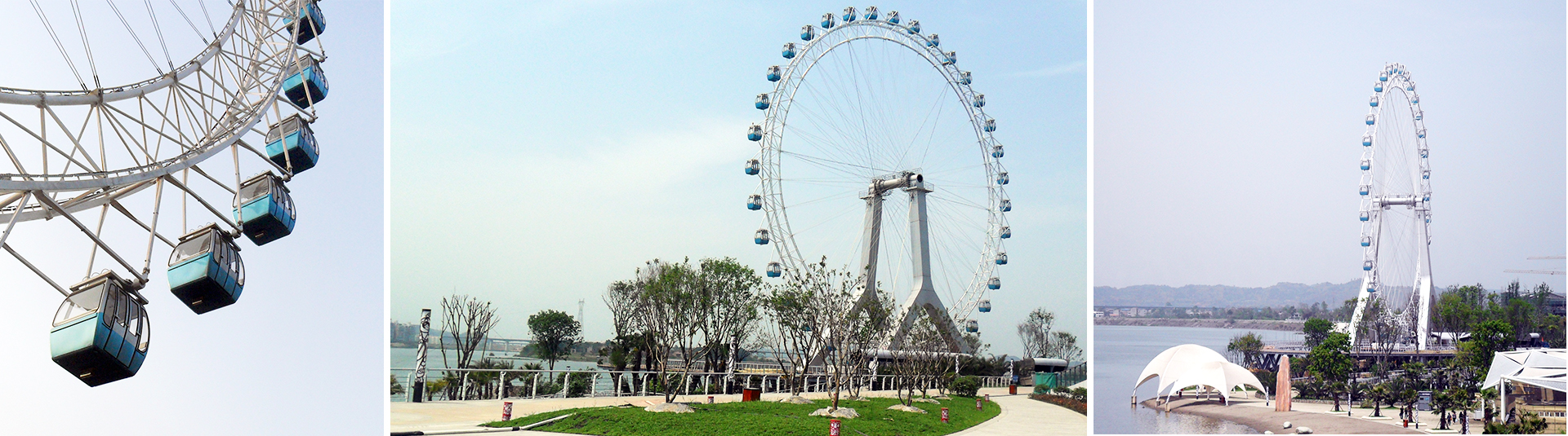 GLC-62A觀覽車高度約62米,支架采用倒Y雙立柱形式,轉(zhuǎn)盤采用輻條式,座艙懸掛在轉(zhuǎn)盤的外側(cè)支撐架上。乘客從站臺乘座艙徐徐升起,升到高空,環(huán)繞一圈后又回到站臺,獨(dú)特的運(yùn)動方式,提供了獨(dú)特的空間體驗(yàn),讓人充分體會在大地和高空中循環(huán)往復(fù)的同時,遂寧市的老城區(qū)的歷史感,新城區(qū)的現(xiàn)代質(zhì)感和涪江的波光粼粼的景色,充分體驗(yàn)天水共一色的美景。