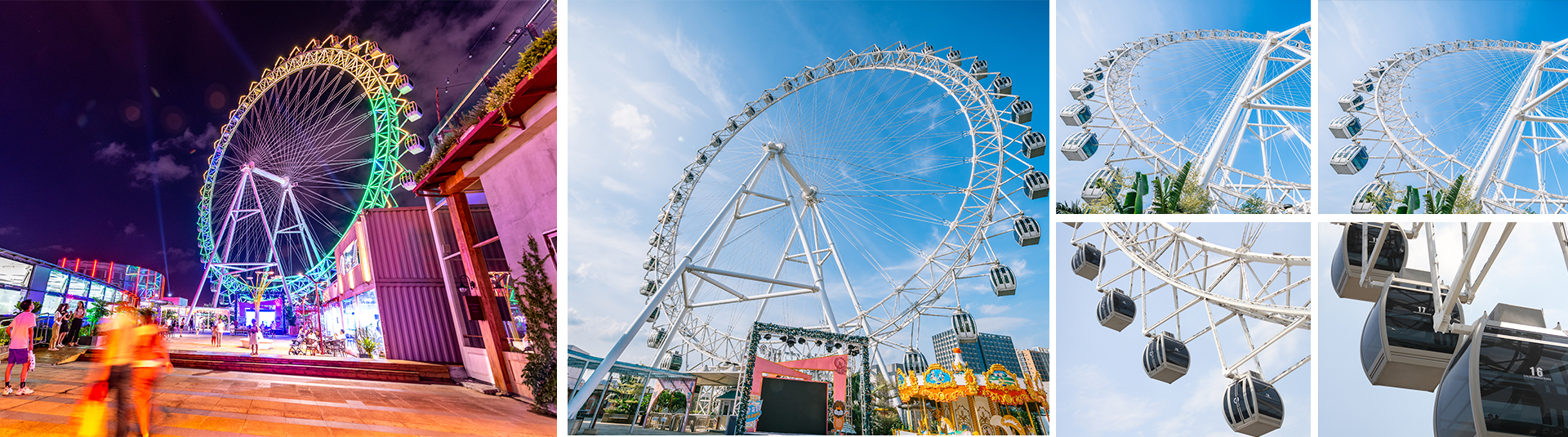 62米觀(guān)覽車(chē),塔架由6根立柱構(gòu)成,轉(zhuǎn)盤(pán)為輻條式,轉(zhuǎn)盤(pán)上均勻分布著36個(gè)吊廂。吊廂運(yùn)作時(shí)配以明麗變幻的燈飾,搭配別具匠心的現(xiàn)場(chǎng)配景,以及柔美動(dòng)聽(tīng)的背景音樂(lè),乘客在吊箱內(nèi)平穩(wěn)悠閑地縱覽周邊美景。