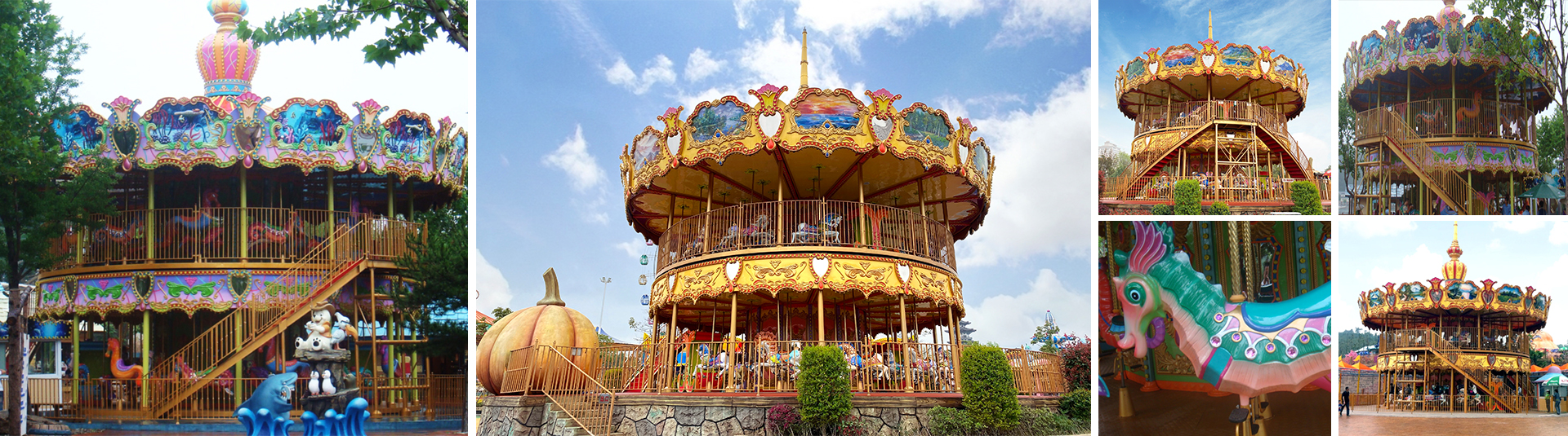 豪華雙層轉(zhuǎn)馬是上、下層可單獨(dú)作旋轉(zhuǎn)運(yùn)動(dòng)的裝飾豪華的轉(zhuǎn)馬,采用歐洲皇家的古典豪華的裝飾風(fēng)格。蓬頂?shù)幕使诩馑睕_云宵,天花板、內(nèi)圍板鑲嵌著彩色浮雕,并配備彩燈。馬匹及宮庭式馬車結(jié)合多彩的花飾,造型奢華大氣流光溢彩。