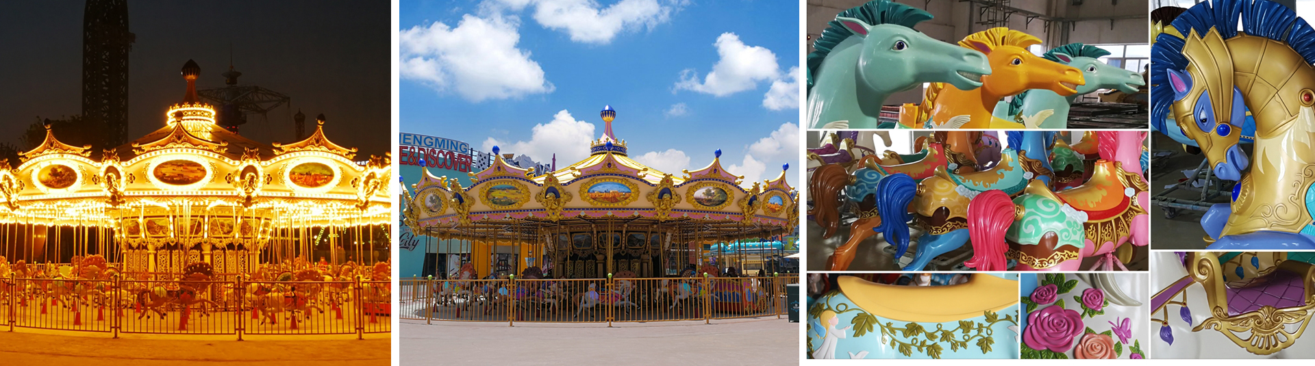 豪華轉(zhuǎn)馬采用歐洲皇家的古典豪華的裝飾風(fēng)格,頂棚華麗,內(nèi)外圍板鑲嵌著彩色浮雕和絢爛彩燈,馬匹及宮庭式馬車結(jié)合多彩的花飾,造型精致夢幻。