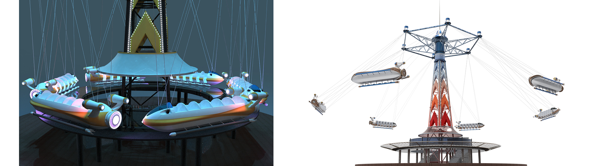 幻速追影六個飛機吊掛座艙隨同旋轉(zhuǎn)架相對塔體自由旋轉(zhuǎn)并外擺升起,繞中心立柱飛行,科幻又刺激。夜間智能燈光系統(tǒng)亮起,成為樂園一道的奇趣風(fēng)景線。