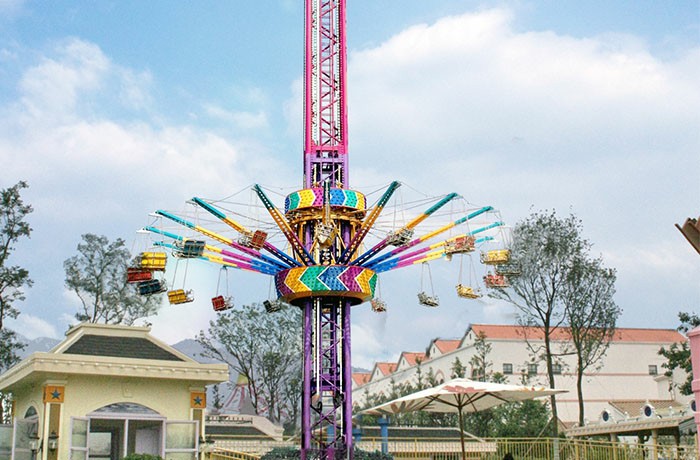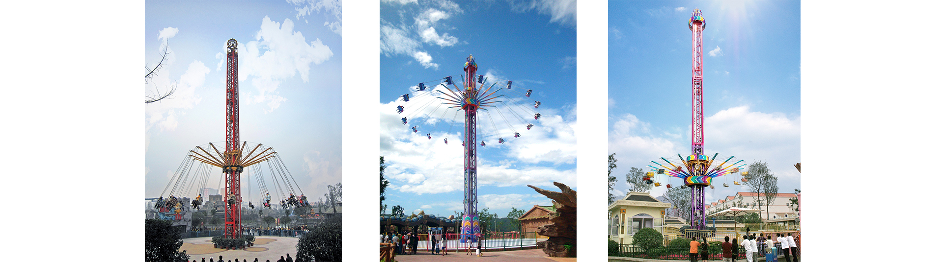 飛行塔設備由塔體、滑?架、吊椅三部分組成。獨有雙人座椅設計,隨著速率越來越快,座椅在半空中向外飄散,在整個游玩過程中乘客可充分享受高速飛行的暢快,刺激又浪漫。