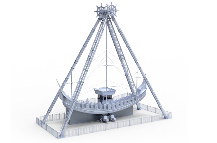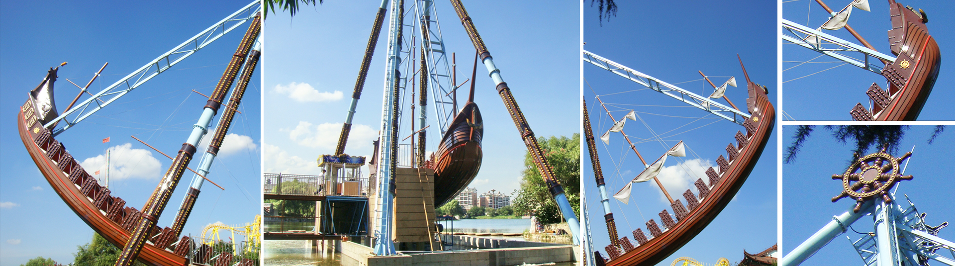 海盜船繞水平軸來回擺動,模擬海盜乘風出海的場景,交替而至的失重 和超重感讓乘客盡情體驗搖擺的樂趣。14排座椅,承載56人。