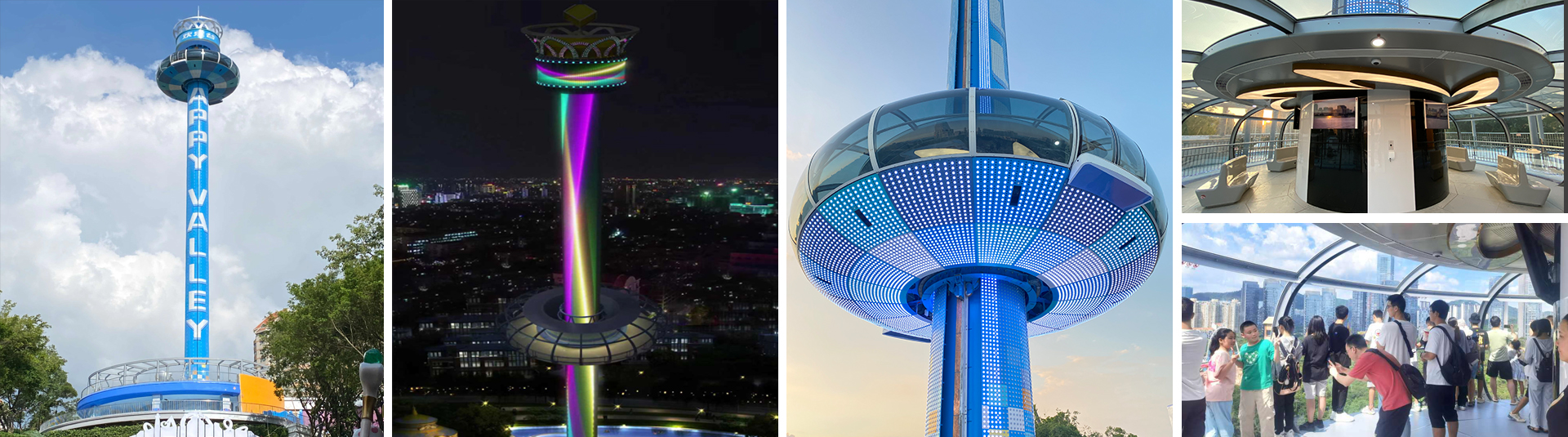 觀景塔擁有可容納100人的“甜甜圈”旋轉艙體,載客能力強。雙自動門進出口的設計便于快速上下客,運營高效。乘客在旋轉艙中360°環(huán)繞式縱情飽覽四周美景,還可通過艙內影音系統(tǒng)感受多元視覺盛宴。夜幕降臨燈光閃耀,璀璨奪目輕易打造夜場焦點,成為聚客地標。