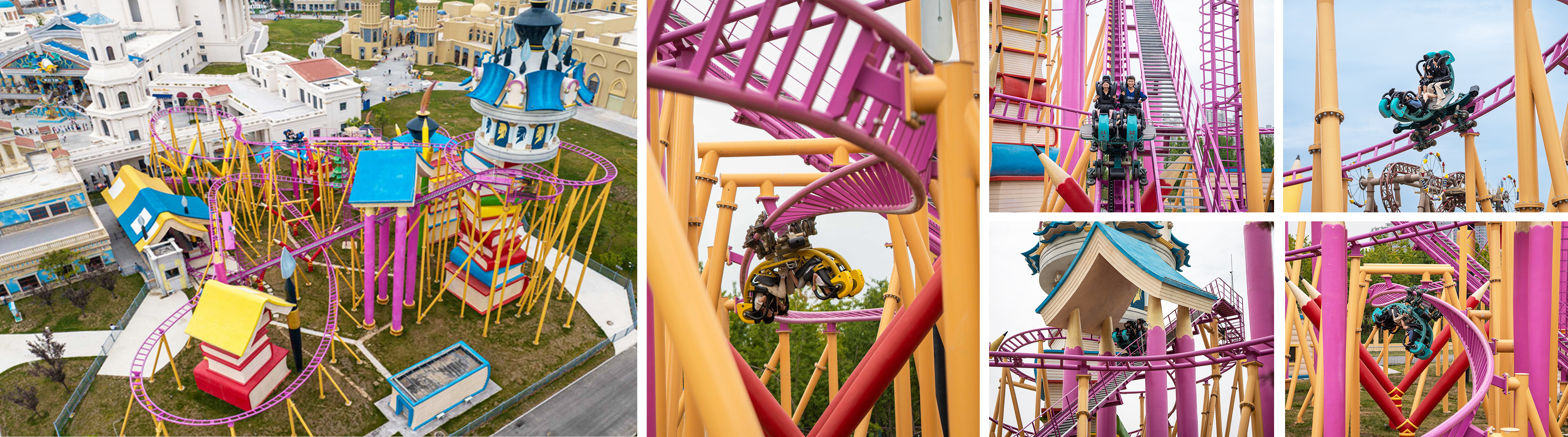 超炫過山車將720°螺旋下降、水平螺旋環(huán)等元素與自轉(zhuǎn)回旋車體結(jié)合,同時(shí)創(chuàng)新地將過山車有傾?的路軌引入到自旋滑車的軌道中,打造出兼具失重、超重和回旋的多重游玩體驗(yàn)。四人車體中游客兩兩對(duì)坐,促進(jìn)互動(dòng)交流。奧德賽歷險(xiǎn)創(chuàng)意主題造型吸引著眾多情侶、親子游客前來挑戰(zhàn)。