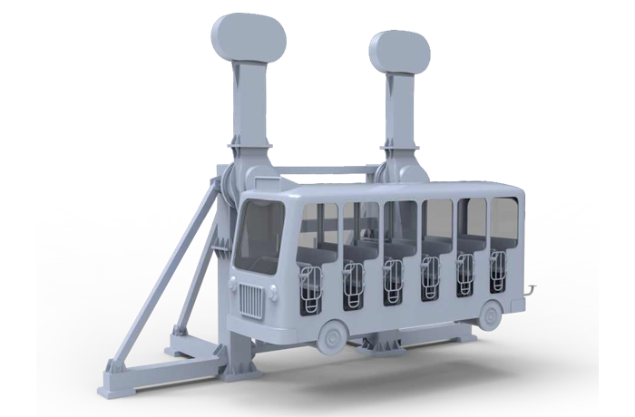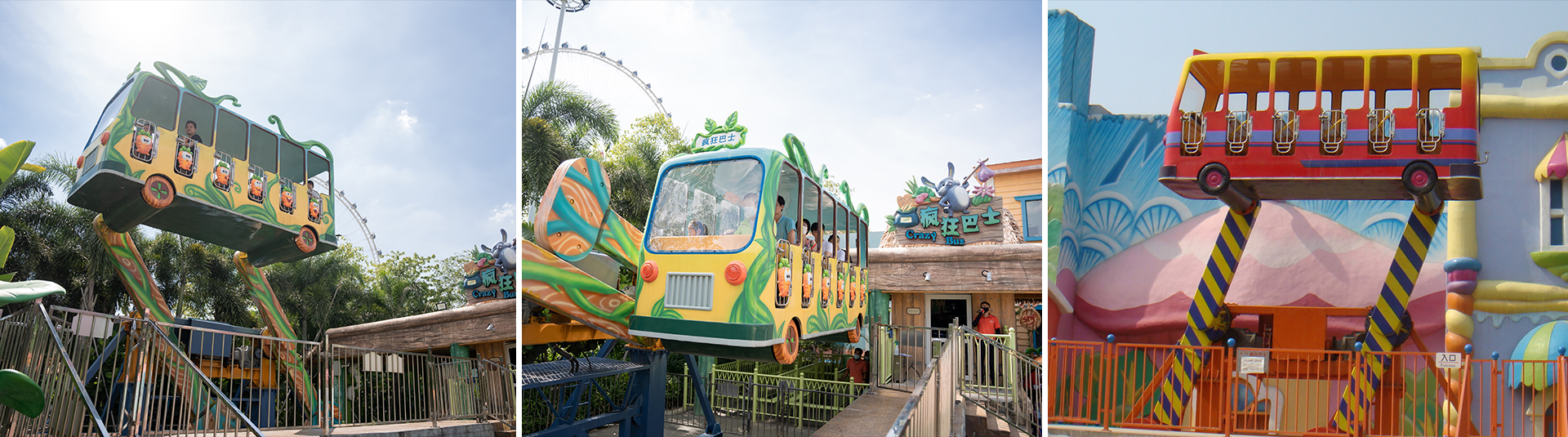 瘋狂巴士配備雙向可逆無級自動調(diào)速系統(tǒng),經(jīng)過減速、分速等一系列機構,實現(xiàn)一臺電機帶動兩個驅(qū)動臂的擺動,帶動巴士的平動,巴士在電氣系統(tǒng)的控制下可以實現(xiàn)正反兩種通過最高點的運動,給乘客以歡樂搖擺的體驗。